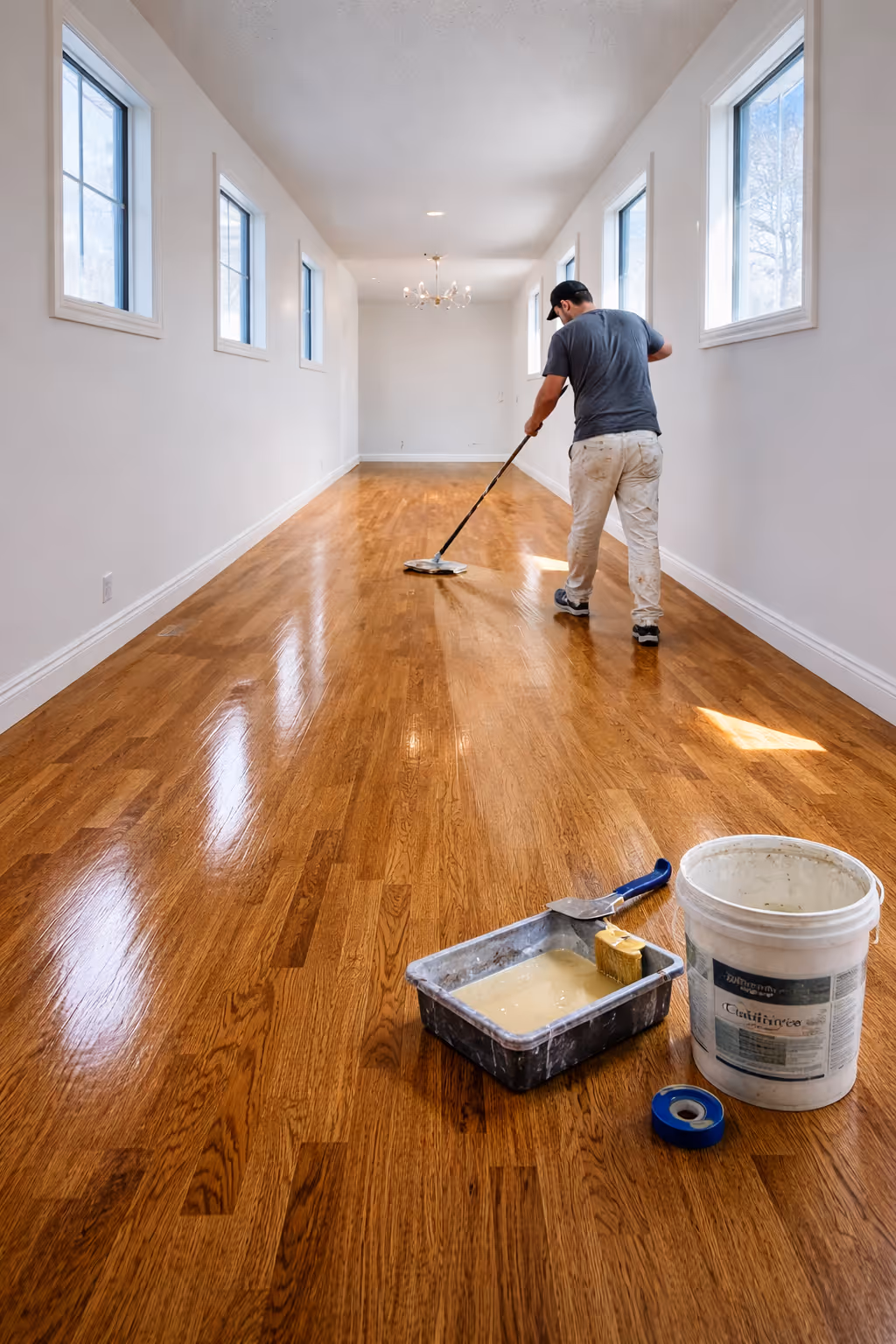 The crew protects floors and finishes, completes repairs and sanding, then moves through the project in a logical order.